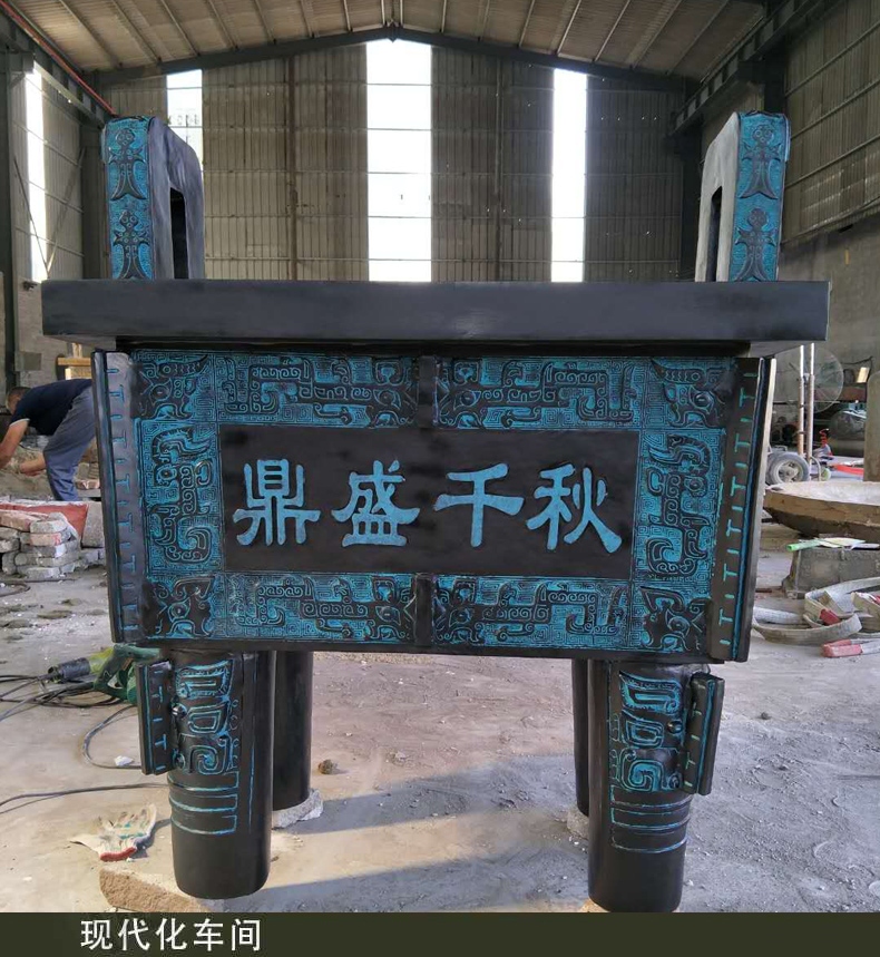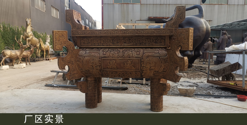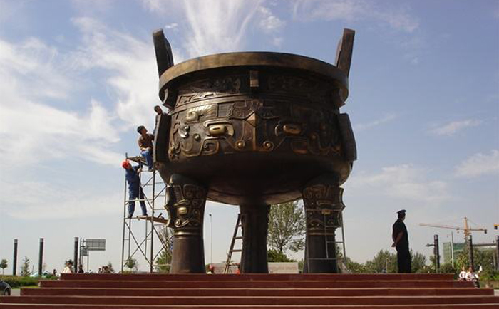 大型銅鼎雕塑是我國青銅文化時期的代表,鼎在古代被視為立國重器,是權(quán)力的象征。直到現(xiàn)在,人們?nèi)匀挥幸环N鼎崇拜的意識,“鼎”字也被賦予“顯赫”、“ 尊貴”、“盛大”等引申意義,如:一言九鼎、大名鼎鼎、鼎盛時期、鼎力相助,等等。鼎又是旌功記績的禮器,周代的國君或王公大臣在重大慶典或接受賞賜時都要鑄鼎,以旌表功績,記載盛況。